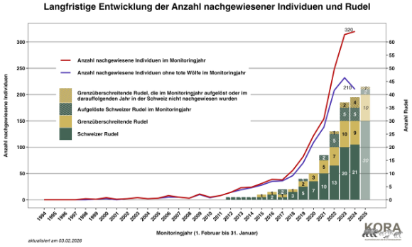SCHWEIZ Nach ihrer Ausrottung sind Wölfe in der Schweiz erstmals wieder 1996 eingewandert. Mit wenigen Ausnahmen stammen alle Wölfe aus der italienischen und der Alpenpopulation. Aufgrund des genetischen Haplotyps HW22, den nur diese Populationen aufweisen ist diese Zuordnung eindeutig möglich. Infolge ihrer grossen Mobilität werden künftig vermehrt Wölfe anderer Population in die Schweiz einwandern werden. 2012 entstand das erste Rudel im Calandagebiet im Kanton Graubünden.